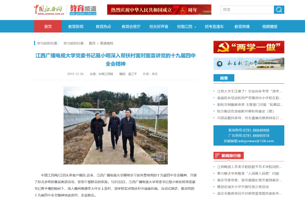 近日,江西教育网、中国江西网等省内主流媒体同时刊登我校党委书记易小明深入定点帮扶村,“面对面、互动式”宣讲党的十九届四中全会精神。