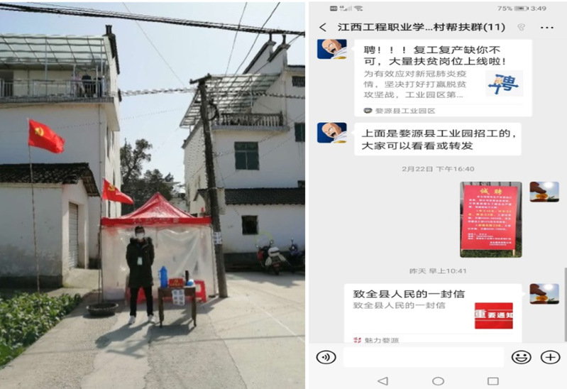 在得到婺源县委组织部取消隔离的通知后,工作队迅速协助村两委扎实做好流动人员和外出务工返乡人员的排查及监测工作,重点监测从湖北武汉、宜昌等重点疫区回村的7户9人,做到应查尽查,能防尽防,并且主动请缨到王村防疫卡点进行值勤,积极投身王村志愿防疫工作。为不耽误王村贫困学生上学困难的问题,工作队积极协调在村贫困学生使用“全省中小学线上教学平台”上课,确保“停课不停学”,教育扶贫与疫情防控“两手抓”。