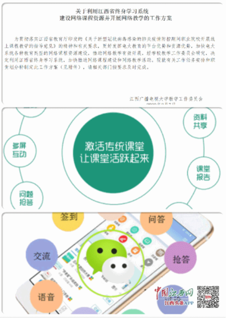 加快信息化建设步伐。150余万分钟视频资源、35万分钟微课、880余门慕课和数万册精品电子图书自21日起,通过江西省终身学习系统向市民开放以来,社会反响强烈。据了解,早在教育部21日下发通知,要求2020年春季学期延期开学之即,江西广播电视大学党委就在第一时间响应,决定充分发挥信息化和数字化学习资源优势,面向全省免费开放自主研发的江西省终身学习系统(一期)为全省市民居家防疫和全校师生宅家学习贡献电大力量。