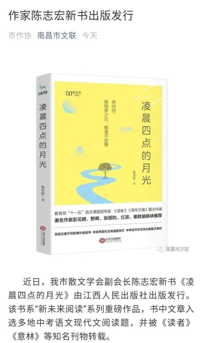 近日,我校教师、南昌市散文学会副会长陈志宏新书《凌晨四点的月光》由江西人民出版社出版发行,南昌市文学艺术界联合会、《南昌晚报》先后进行了相关报道。该书系“新未来阅读”系列重磅作品,书中文章入选多地中考语文现代文阅读题,并被《读者》《意林》等知名刊物转载。