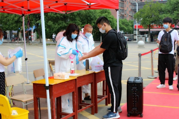 “同学,欢迎回家,请拿好行李,间隔1米排队消毒测温扫码。”党员教师温馨提示。最美校园五月天,喜迎学子复归来。