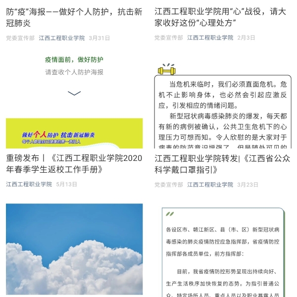 学校党委把疫情防控形势下宣传教育作为重点工作之一,发挥各类阵地优势,及时普及疫情防控和开学复课知识,第一时间通过官网、官微、标语、横幅、宣传栏、QQ群、微信群传达省委省政府、教育厅、学校、学院关于疫情防控和学生返校的重要文件精神,陆续推出了《江西工程职业学院2020年春季学生返校工作手册》《防疫海报——做好个人防护,抗击新冠肺炎》等,引导广大师生做好个人防护。