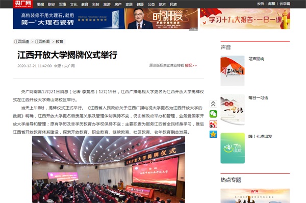 在决胜收官与谋划新局的关键之年,江西省人民政府批准江西广播电视大学更名为英国上市365官网,实现了全省电大人的夙愿。1219-21日,江西日报、“学习强国”学习平台、新华社、人民网等多家主流媒体相继报道英国上市365官网更名盛况。