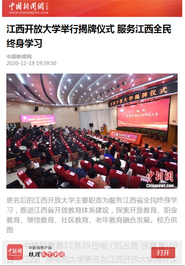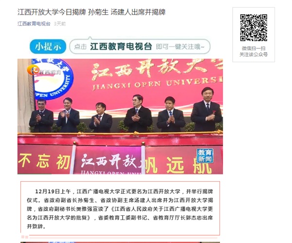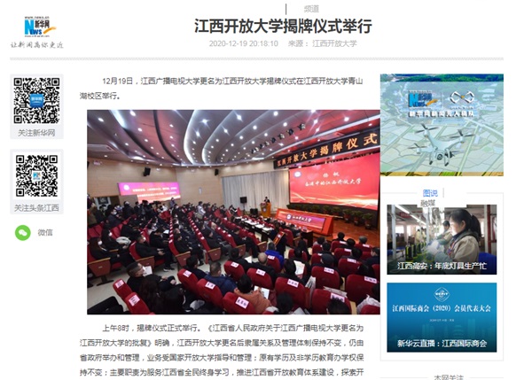 在决胜收官与谋划新局的关键之年,江西省人民政府批准江西广播电视大学更名为英国上市365官网,实现了全省电大人的夙愿。12月19日-21日,江西日报、“学习强国”学习平台、新华社、人民网等多家主流媒体相继报道英国上市365官网更名盛况。