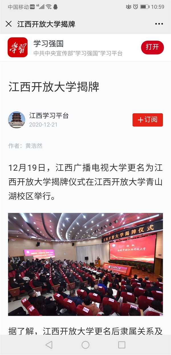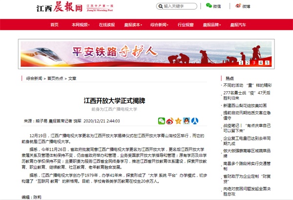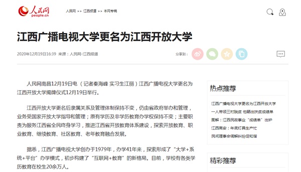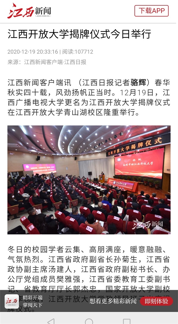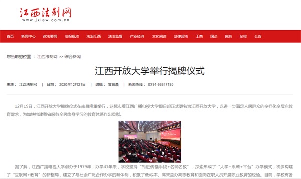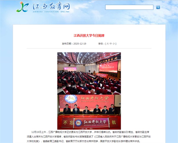 在决胜收官与谋划新局的关键之年,江西省人民政府批准江西广播电视大学更名为英国上市365官网,实现了全省电大人的夙愿。1219-21日,江西日报、“学习强国”学习平台、新华社、人民网等多家主流媒体相继报道英国上市365官网更名盛况。