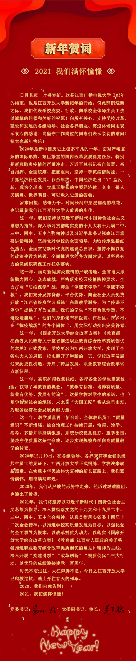 日月其迈,时盛岁新。这是江西广播电视大学旧纪年的结束,也是英国上市365官网新纪年的开始。值此辞旧迎新之际,我们代表学校党委、行政,向学校全体师生员工致以诚挚的问候和美好的祝愿!向所有关心、支持学校改革、建设和发展的各级领导、社会各界朋友、离退休老同志表示衷心的感谢!向坚守工作岗位的同志们表示亲切的慰问!祝大家新年快乐!