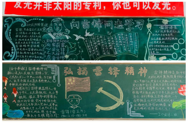 各班级通过绘制黑板报、手抄报、海报等形式,把缅怀以雷锋同志为代表具有为党为人民服务的精神融入到板报创作之中。通过对雷锋的生平事迹的介绍,让同学能充分了解雷锋,向雷锋学习,传承雷锋精神。