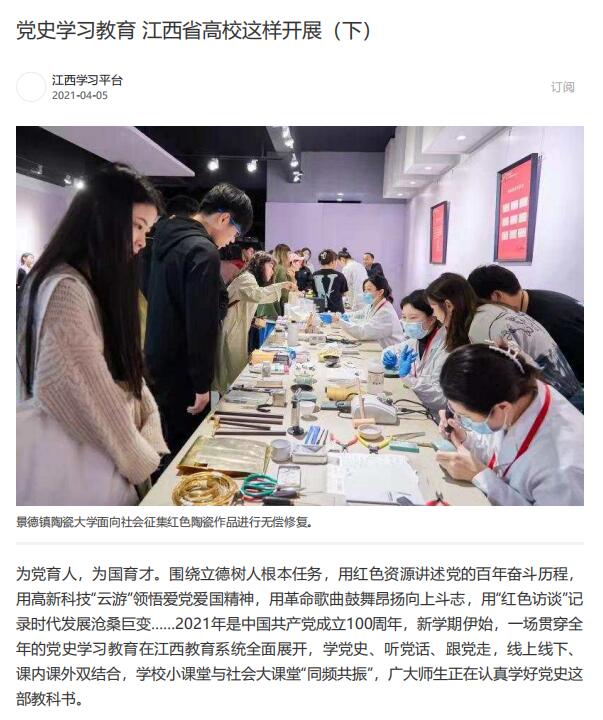 4月5日,江西日报、学习强国、江西新闻客户端等媒体以《党史学习教育 我省高校这样开展(下)》为题,报道江西省各大高校党史学习教育情况,我校《开展“红色之旅接力行”学党史》收录其中。