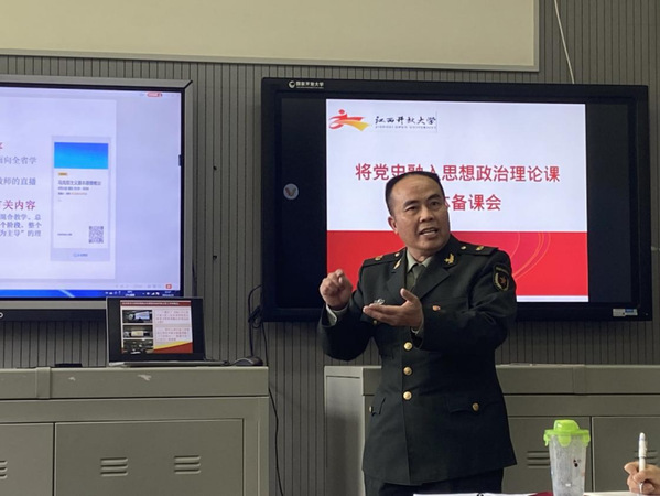 会上,人武学院陈忠老师分享了自己的教学课件,重点介绍了组建学院“十大军事原则”师生宣讲团(试讲)的过程和成果,提出作为思政教师,要深挖党史资料,帮助学员打开阅读的思路,党史教育是一项长期的工作,先理论后实践,才能达到军事党史教育的效果。