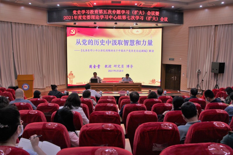 会上,周金堂教授作《从党的历史中汲取智慧和力量》专题辅导。周教授首先从当下国际、国内的背景形势出发,阐明了开展党史学习教育的重要意义,而后从“突出政治战略,体现时代特色”“围绕主题主线,反映主流本质”“资料来源丰富,重视披露新指标”三个方面对《毛泽东 邓小平 江泽民 胡锦涛关于中国共产党历史论述摘编》一书进行了详细的解读。他指出,这本书的发行对广大党员学习了解历史,从历史中汲取智慧和力量,增强“四个意识”,坚定“四个自信”,做到“两个维护”,全面建设社会主义现代化国家,实现中华民族伟大复兴的中国梦,具有重要的指导意义。