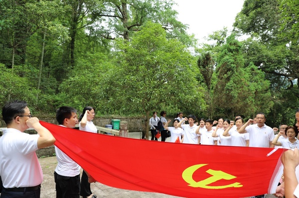 在宜丰县天宝乡黄沙大捷纪念碑前,全体党员面向鲜红的党旗整齐列队、高举右拳重温入党誓词。铿锵的誓词,让党员们仿佛重新回到加入党组织时的光荣时刻,更加坚定了自己的理想信念和初心使命。