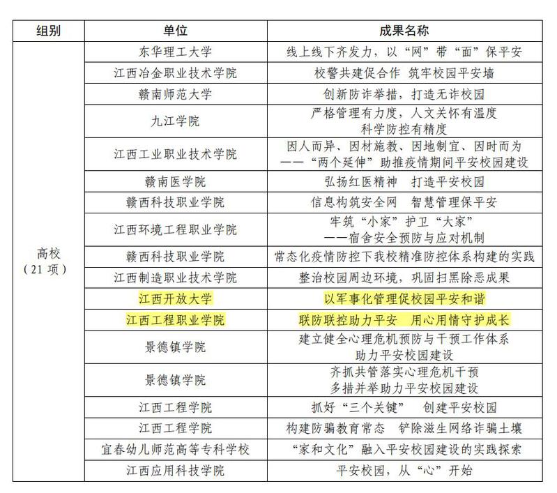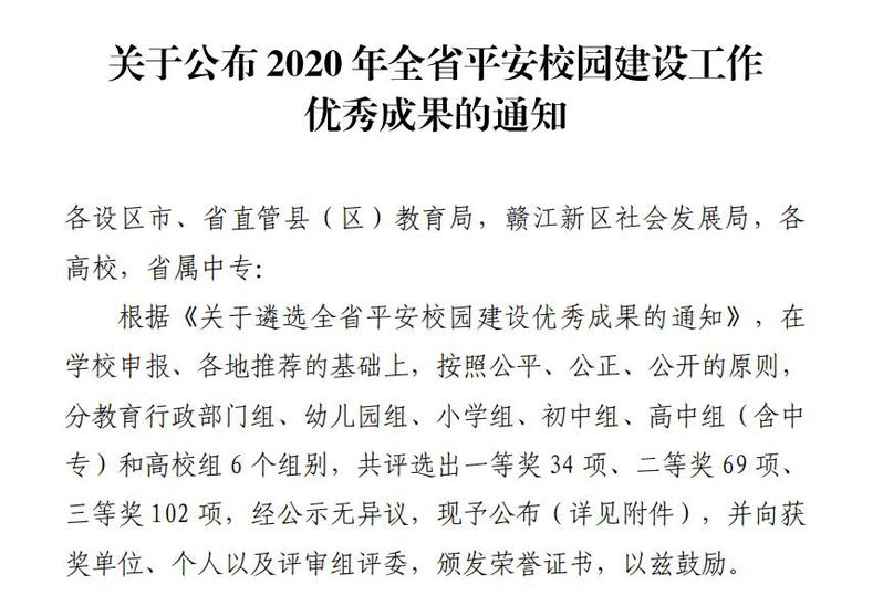 近日,省教育厅公布2020年全省平安校园建设工作优秀成果,我校《以军事化管理促校园平安和谐》、工程职院《联防联控助力平安 用心用情守护成长》两项成果获得高校组三等奖。