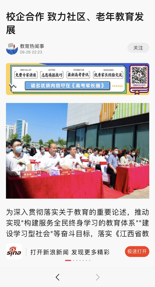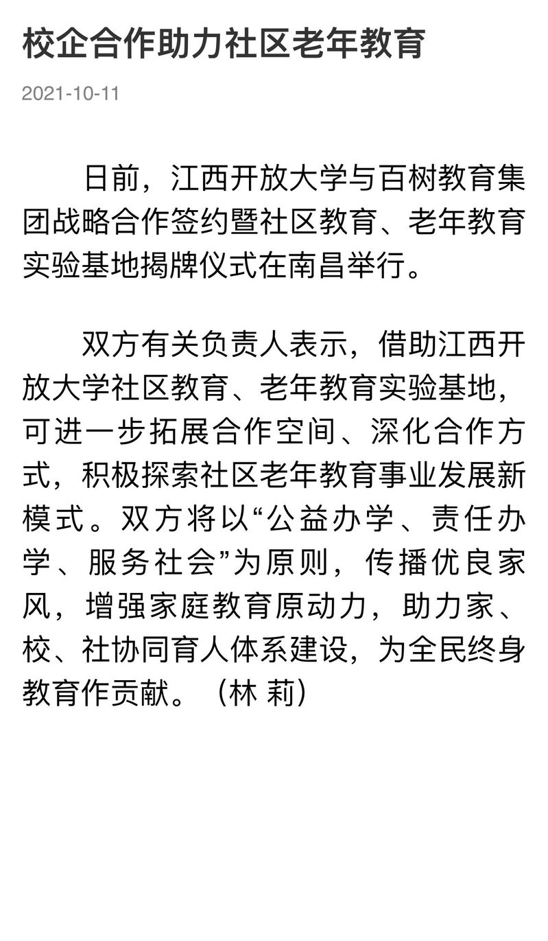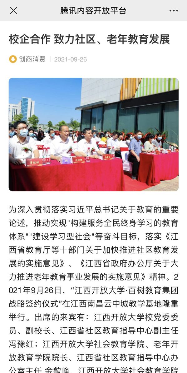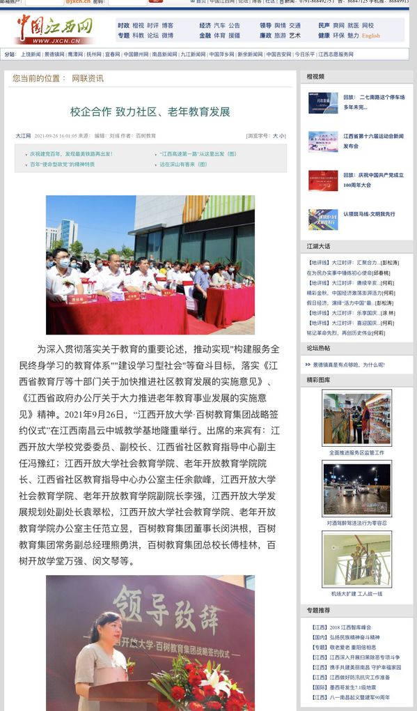 日前,英国上市365官网与百树教育集团战略合作签约暨社区教育、老年教育实验基地揭牌仪式在南昌举行。江西日报、大江网、江西新闻等多家媒体报道我校以校企合作助推社区老年教育。