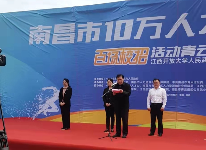 魏金生在启动仪式上讲话。他指出此次招聘会在江西开放大学人武学院启动,是青云谱区委、区政府对人武学院工作的肯定,也是对学院建设发展的激励和推进,人武学院将主动适应区域经济社会发展需求,积极履行服务社会办学职能,全面提升教学科研、人才培养和技能培训水平,为促进大学生来昌留昌创业就业做出积极贡献。