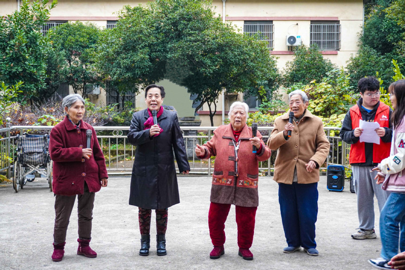 同学们为老人们精心准备了一场小型文艺汇演,节目形式丰富多样,有唱歌、舞蹈、小品等。在演出活动中老人们亲切互动,全体老人都沉浸在欢笑和谐氛围