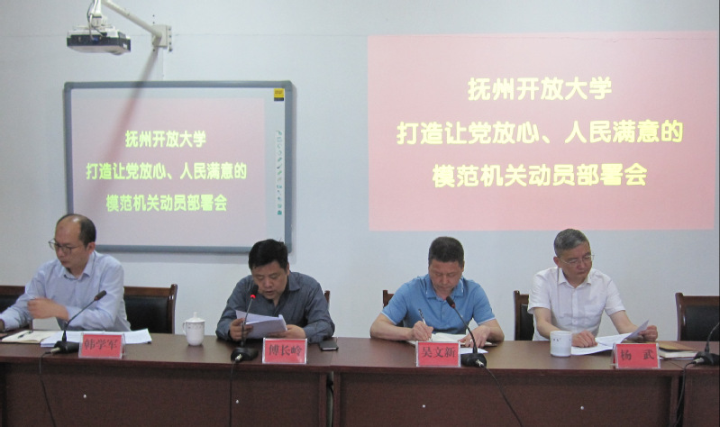 4月26日上午,抚州开放大学召开打造让党放心、人民满意的模范机关动员部署会,校党委副书记、校长傅长岭主持会议并作动员讲话,班子成员出席会议,全校教职工参加会议。