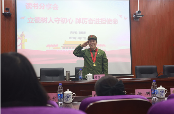 周学松教授作题为《努力奋进无悔人生》主题演讲。从“弃干从戎、参军入党”、“甘当砖瓦、躬耕育人”、“老有所学、尽力而为”三个方面与大家分享了他的丰富人生。在最美好的青春年华时光里加入中国共产党,以满腔的热情投入党的教育事业,入党53年来,他时刻铭记一名共产党员、一位人民教师的职责,踏踏实实工作,兢兢业业育人,用自己的实际行动努力把党的优良传统传承下去,在新时代奉献着自己的力量。