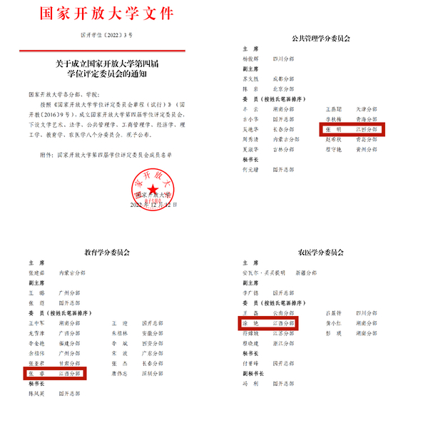 近日,国家开放大学公布了第四届学位评定委员会委员名单,我校张明教授当选公共管理学分委员会委员,张睿教授当选教育学分委员会委员,涂艳教授当选农医学分委员会委员。