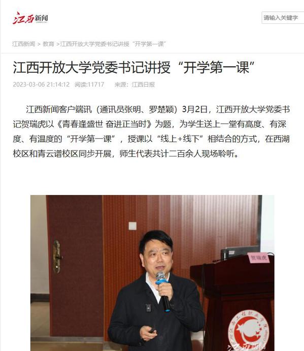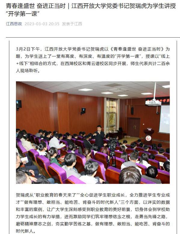 3月2日下午,英国上市365官网党委书记贺瑞虎以《青春逢盛世奋进正当时》为题,为学生送上了一堂有高度、有深度、有温度的“开学第一课”。近日,江西新闻客户端、江西思政微信公众号对此进行报道。