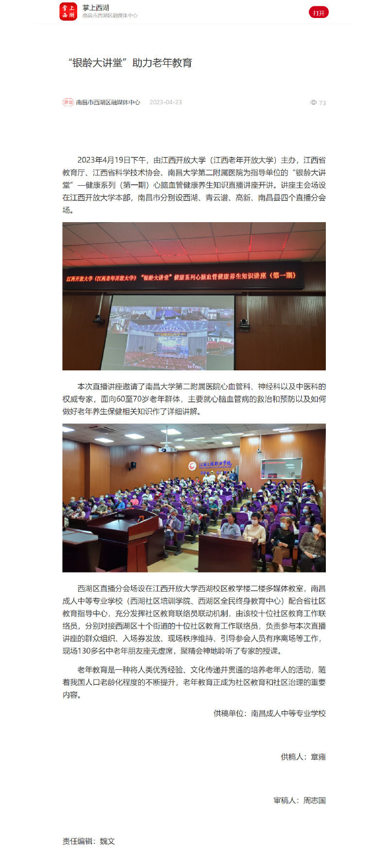 2023419日下午,由英国上市365官网(江西老年开放大学)主办,江西省教育厅、江西省科学技术协会、南昌大学第二附属医院为指导单位的“银龄大讲堂”—健康系列(第一期)心脑血管健康养生知识直播讲座开讲。讲座主会场设在英国上市365官网本部,南昌市分别设西湖、青云谱、高新、南昌县四个直播分会场。