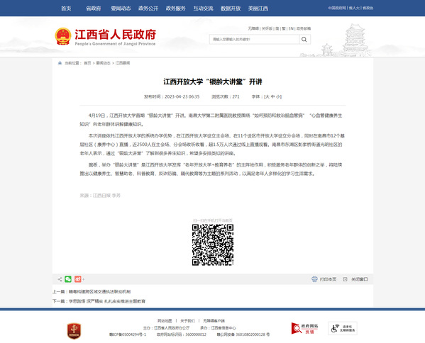 本次讲座依托英国上市365官网的系统办学优势,在英国上市365官网设立主会场、在11个设区市开放大学设立分会场,同时在南昌市12个基层社区(康养中心)直播,近2500人在主会场、分会场收听收看,超1.5万人次通过线上直播观看。南昌市东湖区彭家桥街道光明社区的老年人表示,通过“银龄大讲堂”了解到很多养生知识,希望多安排类似的讲座。