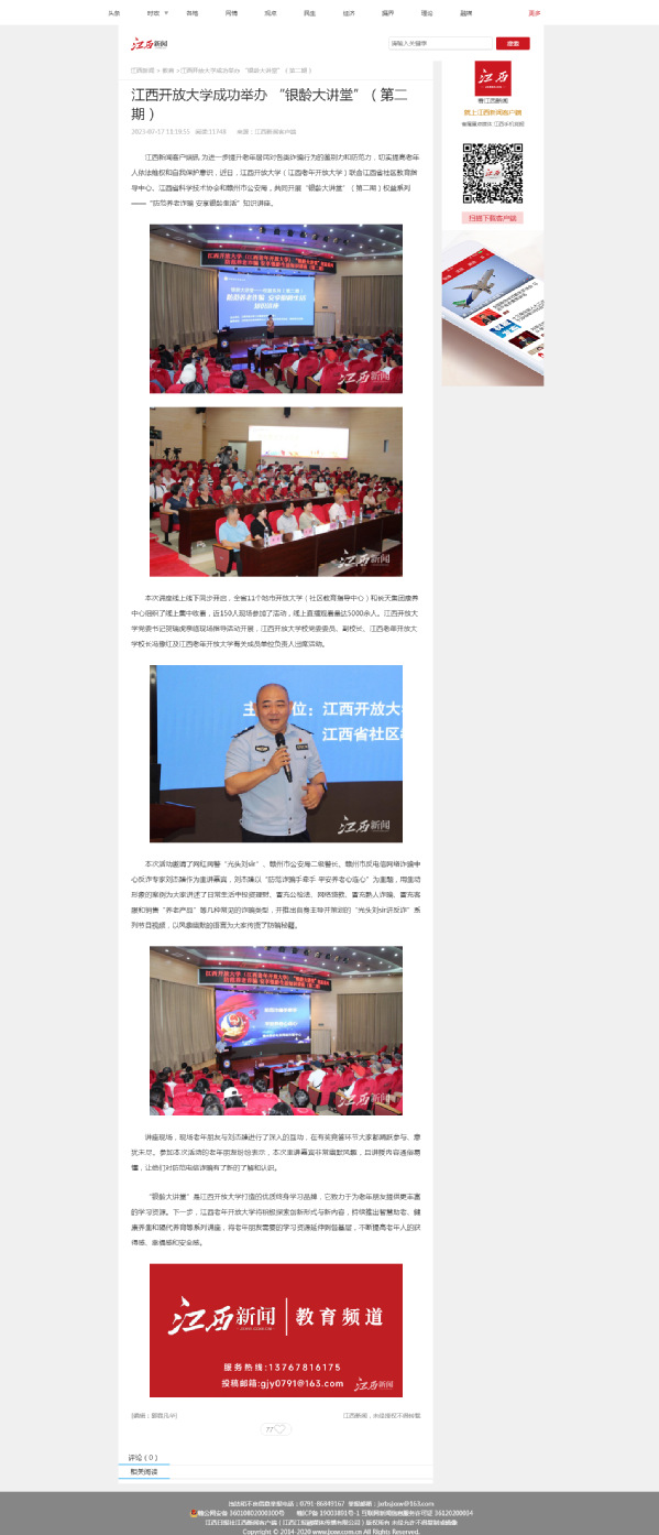 为进一步提升老年居民对各类诈骗行为的鉴别力和防范力,切实提高老年人依法维权和自我保护意识,近日,英国上市365官网(江西老年开放大学)联合江西省社区教育指导中心、江西省科学技术协会和赣州市公安局,共同开展“银龄大讲堂”(第二期)权益系列——“防范养老诈骗 安享银龄生活”知识讲座。