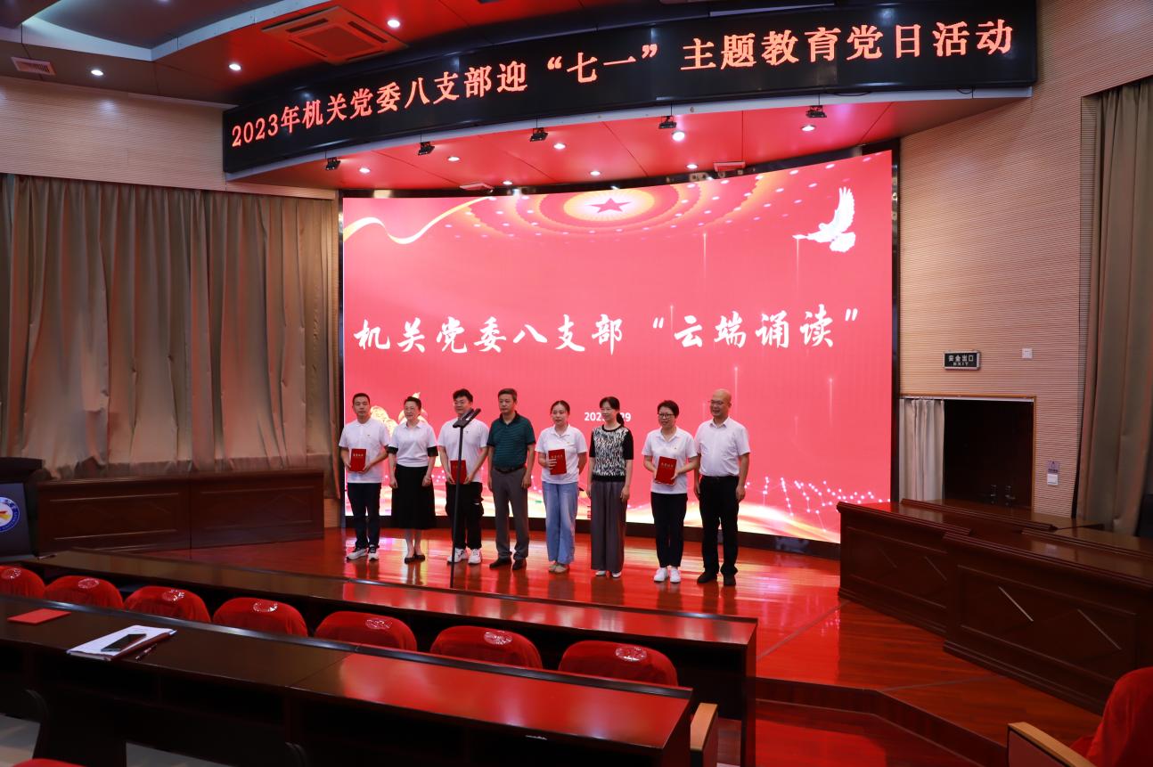 机关党委八支部以“云端党建”历程记录短片开启主题党日活动。首先进行的是“七一”云端诵读活动,党员代表朗诵《丰碑》、《党旗颂》、《国旗》、《高举中国特色社会主义伟大旗帜,为全面建设社会主义现代化国家而团结奋斗》等经典红色诗句及原创诗歌散文。其次是对“七一”云端诵读获奖者和年度支部活动积极分子进行了表彰。接着是集体为朱蔓菁、肖维松过“政治生日”,郭英代表支部向过“政治生日”的党员送上生日祝福,同时希望每名党员干部能够以本次活动为契机,补精神之钙,筑思想之魂,牢记自己政治旅途的起点,不忘自己对党许下的铮铮誓言。活动最后,全体党员重温入党誓词,深深表达对党和祖国的热爱之情。