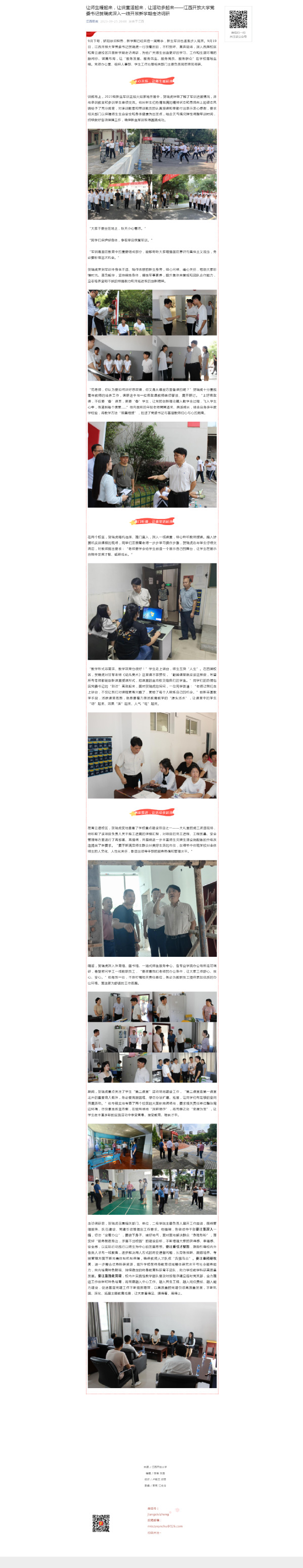 9月下旬,骄阳依旧炽热,新学期已经开启一周有余,新生军训也逐渐步入尾声。英国上市365官网党委书记贺瑞虎一行顶着烈日,不打招呼、直奔现场,深入西湖校区和青云谱校区开展新学期走访调研,为给广大师生创造更好的学习、工作和生活环境把脉问诊、谋篇布局,让“服务发展、服务民生、服务党员、服务群众”在学校落地生根。党政办公室、组织人事部、学生工作处等相关部门主要负责同志陪同调研。
