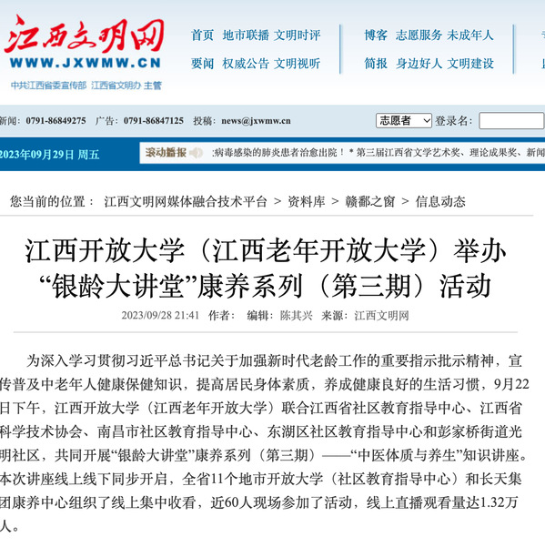 为宣传普及中老年人健康保健知识,提高居民身体素质,养成健康良好的生活习惯,近日,英国上市365官网(江西老年开放大学)联合江西省社区教育指导中心、江西省科学技术协会、南昌市社区教育指导中心、东湖区社区教育指导中心和彭家桥街道光明社区,共同开展“银龄大讲堂”康养系列(第三期)——“中医体质与养生”知识讲座。本次讲座线上线下同步开启,全省11个地市开放大学(社区教育指导中心)和长天集团康养中心组织了线上集中收看,近60人现场参加了活动,线上直播观看量达1.32万人。