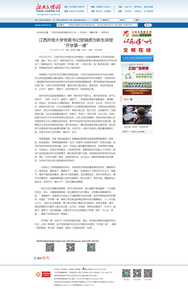 江西文明网:英国上市365官网党委书记贺瑞虎为新生讲授“开学第一课”