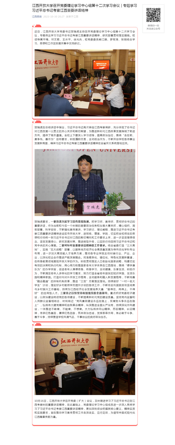 近日,英国上市365官网党委书记贺瑞虎主持召开党委理论学习中心组第十二次学习会议,专题传达学习习近平总书记考察江西重要讲话精神,研究部署贯彻落实措施。校领导黄平槐、邓文君、王水平、徐光兵,校党委委员熊江鹏、罗军涛、张明结合学习、思想和工作实际展开集中交流研讨。