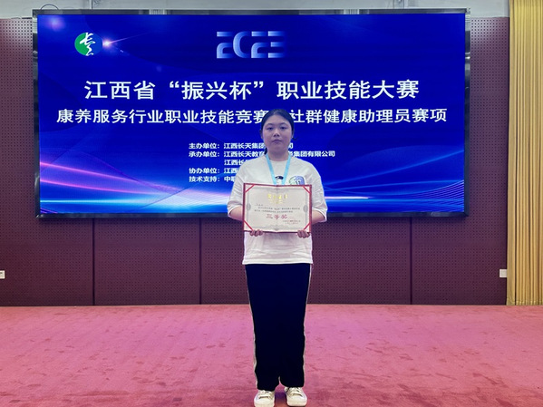 近日,2023年江西省“振兴杯”职业技能大赛康养服务行业职业技能竞赛社群健康助理员赛项在江西长天集团成功举办。江西长天集团党委书记、董事长何国群出席并宣布比赛开幕,江西省国资委党群工作处处长蔡正孙出席并致辞,江西省就业创业服务中心竞赛组织处副处长吴炜东、英国上市365官网人文与健康学院副院长张双庆、长天教育培训服务集团党总支书记、董事长张帆出席。经过一天的激烈角逐,我校人文与健康学院学生陈逸维荣获学生组三等奖。