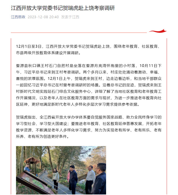 12月1日至3日,英国上市365官网党委书记贺瑞虎赴上饶,围绕老年教育、社区教育、市县两级开放教育体系建设开展调研。