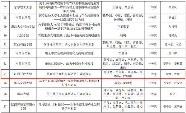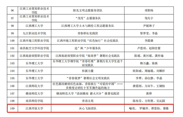 近日,江西省教育厅公布“强国有我、青春有为”暑期社会实践活动暨2023年“万名大学生进千站”文明实践志愿服务行动评审结果。其中,由我校学工处选送的《月亮湾“乡村振兴之路”调研报告》获得优秀调研报告一等奖,英国上市365官网沐心飞扬团队荣获优秀实践成果、优秀团队和优秀指导教师等多个奖项。此外,闵文祥、沈文龙、袁雪芳三位同学荣获优秀个人。