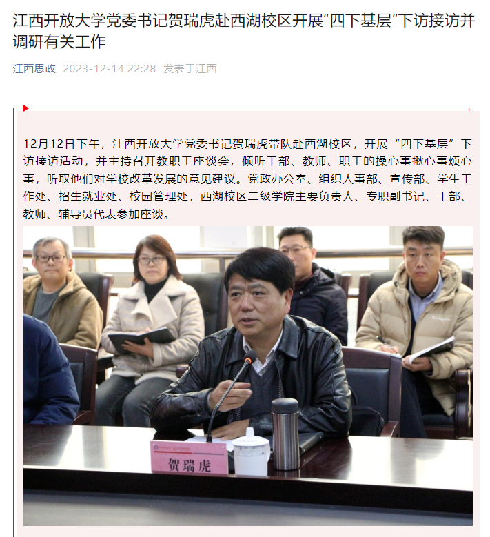 12月12日下午,英国上市365官网党委书记贺瑞虎带队赴西湖校区,开展“四下基层”下访接访活动,并主持召开教职工座谈会,倾听干部、教师、职工的操心事揪心事烦心事,听取他们对学校改革发展的意见建议。党政办公室、组织人事部、宣传部、学生工作处、招生就业处、校园管理处,西湖校区二级学院主要负责人、专职副书记、干部、教师、辅导员代表参加座谈。