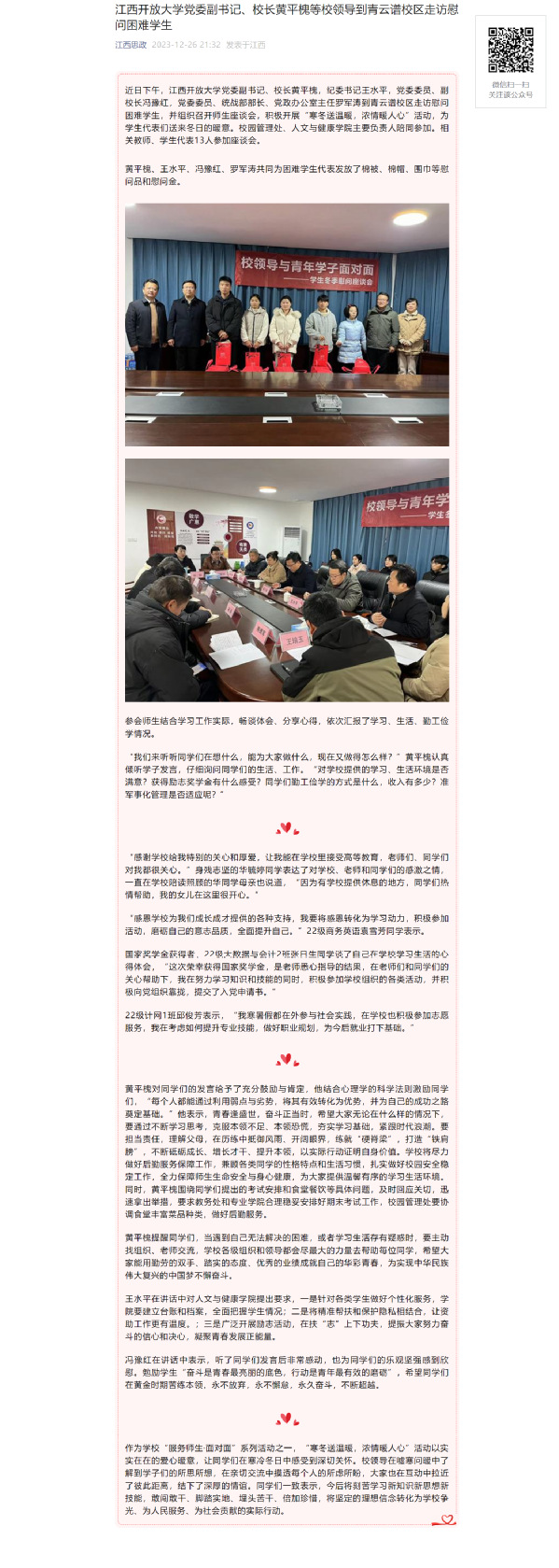 近日下午,英国上市365官网党委副书记、校长黄平槐,纪委书记王水平,党委委员、副校长冯豫红,党委委员、统战部部长、党政办公室主任罗军涛到青云谱校区走访慰问困难学生,并组织召开师生座谈会,积极开展“寒冬送温暖,浓情暖人心”活动,为学生代表们送来冬日的暖意。校园管理处、人文与健康学院主要负责人陪同参加。相关教师、学生代表13人参加座谈会。