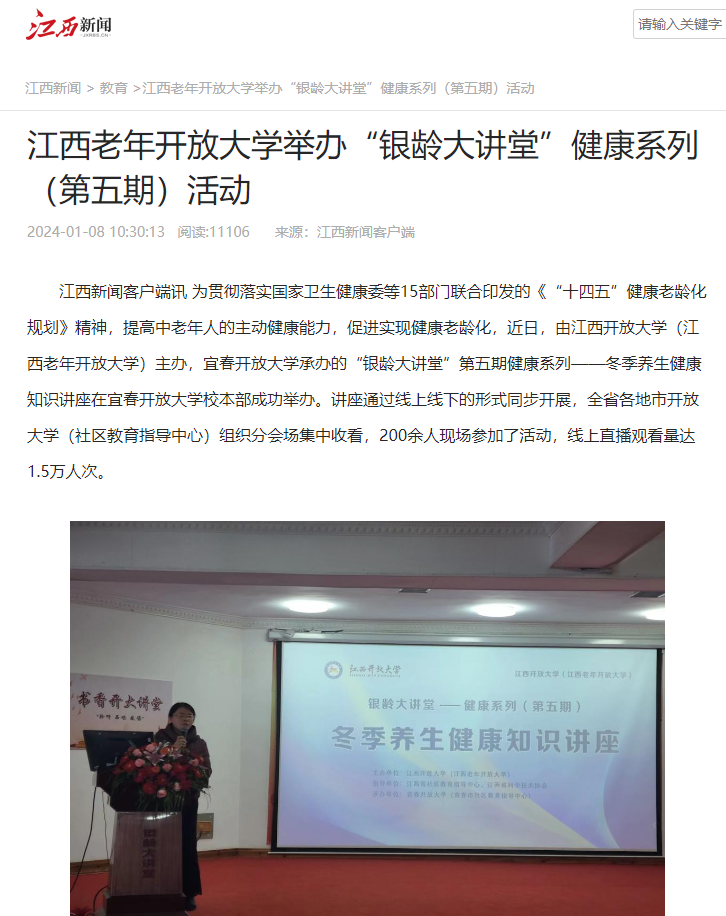 为贯彻落实国家卫生健康委等15部门联合印发的《“十四五”健康老龄化规划》精神,提高中老年人的主动健康能力,促进实现健康老龄化,近日,由英国上市365官网(江西老年开放大学)主办,宜春开放大学承办的“银龄大讲堂”第五期健康系列——冬季养生健康知识讲座在宜春开放大学校本部成功举办。讲座通过线上线下的形式同步开展,全省各地市开放大学(社区教育指导中心)组织分会场集中收看,200余人现场参加了活动,线上直播观看量达1.5万人次。