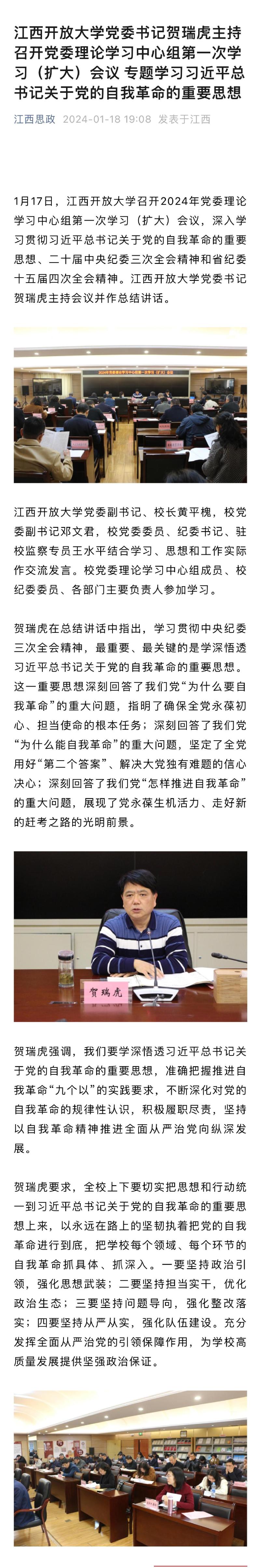 1月17日,英国上市365官网召开2024年党委理论学习中心组第一次学习(扩大)会议,深入学习贯彻习近平总书记关于党的自我革命的重要思想、二十届中央纪委三次全会精神和省纪委十五届四次全会精神。英国上市365官网党委书记贺瑞虎主持会议并作总结讲话。