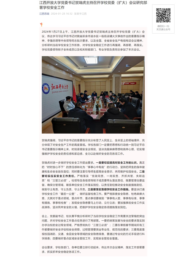 2024年1月27日上午,英国上市365官网党委书记贺瑞虎主持召开学校党委(扩大)会议,传达学习习近平总书记对我省新余市渝水区一临街店铺火灾事故作出的重要指示精神,李强总理等中央领导同志批示要求,以及全国、全省安全生产电视电话会议精神,分析研判当前学校安全工作形势,对学校安全稳定工作进行再强调、再部署、再落实。学校党委领导班子全体成员以及相关职能部门、专业学院负责同志参加了本次会议。