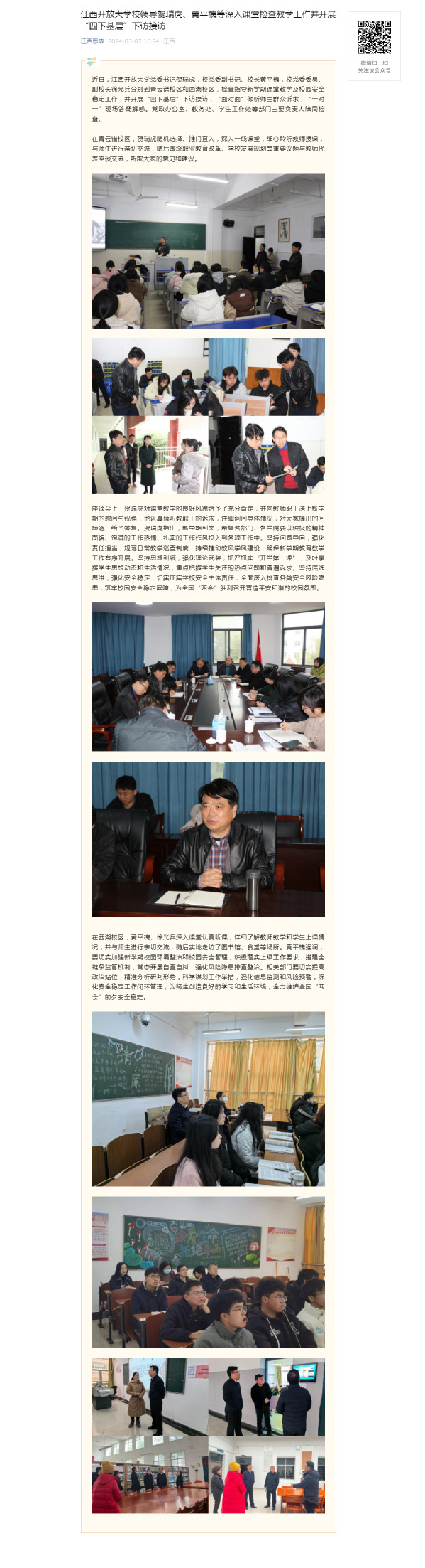 近日,英国上市365官网党委书记贺瑞虎,校党委副书记、校长黄平槐,校党委委员、副校长徐光兵分别到青云谱校区和西湖校区,检查指导新学期课堂教学及校园安全稳定工作,并开展“四下基层”下访接访,“面对面”倾听师生群众诉求,“一对一”现场答疑解惑。党政办公室、教务处、学生工作处等部门主要负责人陪同检查。