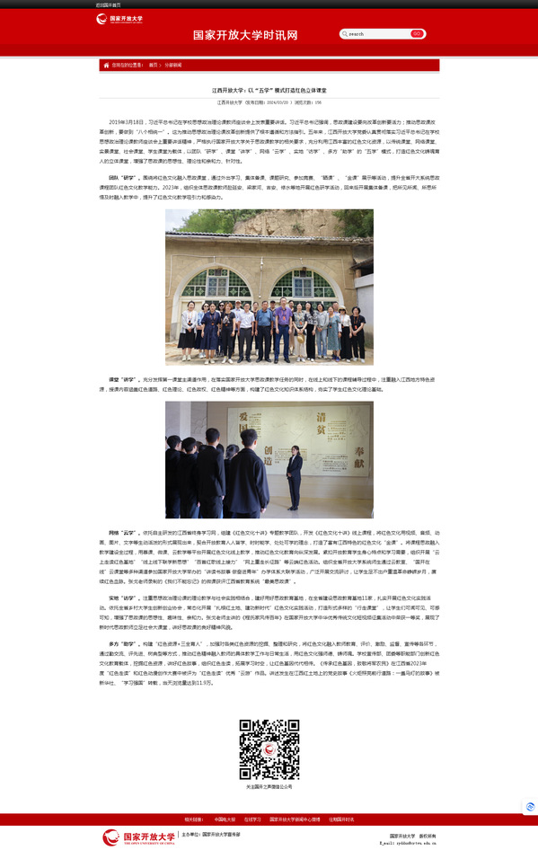 2019年3月18日,习近平总书记在学校思想政治理论课教师座谈会上发表重要讲话。习近平总书记强调,思政课建设要向改革创新要活力;推动思政课改革创新,要做到“八个相统一”。这为推动思想政治理论课改革创新提供了根本遵循和方法指引。五年来,英国上市365官网党委认真贯彻落实习近平总书记在学校思想政治理论课教师座谈会上重要讲话精神,严格执行国家开放大学关于思政课教学的相关要求,充分利用江西丰富的红色文化资源,以传统课堂、网络课堂、实景课堂、社会课堂、学生课堂为载体,以团队“研学”、课堂“讲学”、网络“云学”、实地“访学”、多方“助学”的“五学”模式,打造红色文化铸魂育人的立体课堂,增强了思政课的思想性、理论性和亲和力、针对性。