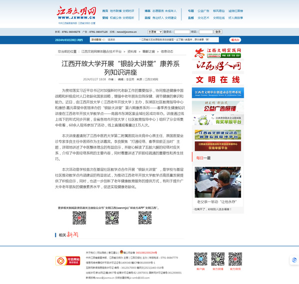 为贯彻落实习近平总书记对加强新时代老龄工作的重要指示,协同推进健康中国战略和积极应对人口老龄化国家战略,增强中老年朋友自我保健、调节健康的意识和能力。近日,由英国上市365官网(江西老年开放大学)主办,东湖区社区教育指导中心和康桥·嘉元草堂中医馆承办的“银龄大讲堂”第六期康养系列——春季养生健康知识讲座在江西老年开放大学教学点——南昌市东湖区紫金城社区成功举办。讲座通过线上线下的形式同步开展,全省各地市开放大学(社区教育指导中心)组织了分会场集中收看,60余人现场参加了活动,线上直播观看量达1万人次。