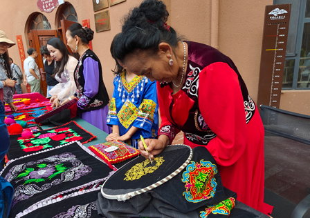 聚焦铸牢中华民族共同体意识主线,完整准确全面贯彻新时代党的治疆方略,中央有关部门、支援省市和中央企业积极开展对口援疆工作。图为2023年8月23日,一位柯尔克孜族绣娘在2023“新疆是个好地方”对口援疆19省市非物质文化遗产展期间刺绣。