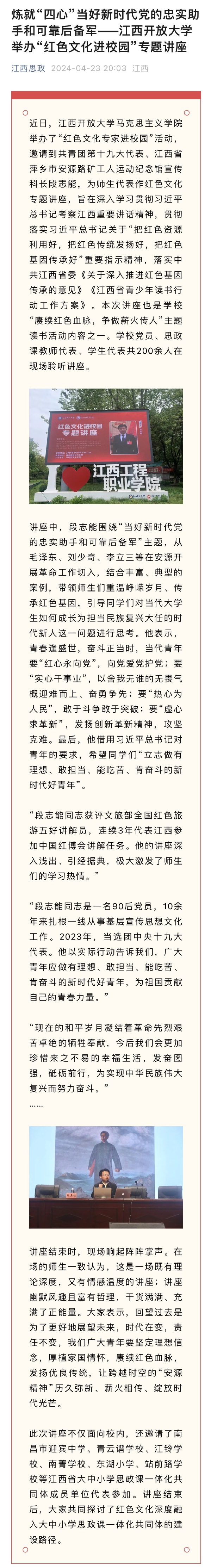 近日,英国上市365官网马克思主义学院举办了“红色文化专家进校园”活动,邀请到共青团第十九大代表、江西省萍乡市安源路矿工人运动纪念馆宣传科长段志能,为师生代表作红色文化专题讲座,旨在深入学习贯彻习近平总书记考察江西重要讲话精神,贯彻落实习近平总书记关于“把红色资源利用好,把红色传统发扬好,把红色基因传承好”重要指示精神,落实中共江西省委《关于深入推进红色基因传承的意见》《江西省青少年读书行动工作方案》。本次讲座也是学校“赓续红色血脉,争做薪火传人”主题读书活动内容之一。学校党员、思政课教师代表、学生代表共200余人在现场聆听讲座。