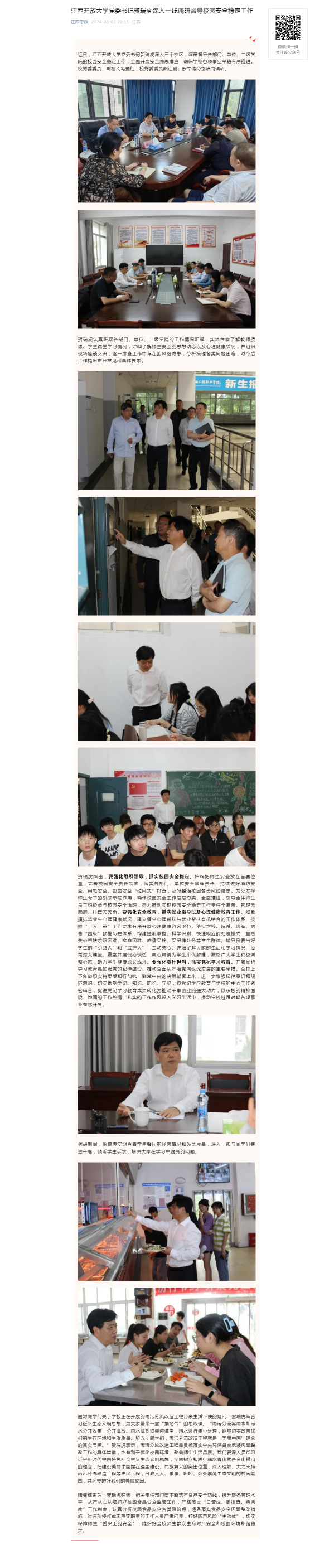 近日,英国上市365官网党委书记贺瑞虎深入三个校区,调研督导各部门、单位、二级学院的校园安全稳定工作,全面开展安全隐患排查,确保学校各项事业平稳有序推进。校党委委员、副校长冯豫红,校党委委员熊江鹏、罗军涛分别陪同调研。原文地址:https://mp.weixin.qq.com/s?__biz=MzI1OTM4MDMzMA==&mid=2247590623&idx=3&sn=890b017e8707ef80508e321cf57bf022&chksm=ea7ae7dadd0d6ecc34d69c8a2989749fdb476597314044b5b7a6aa6d50d4dc8f7231efcf9591&mpshare=1&scene=23&srcid=0604IhdFx8INWZB6Nicnp2mD&sharer_shareinfo=27955339751b49c9cd3c3d3dc63b0533&sharer_shareinfo_first=27955339751b49c9cd3c3d3dc63b0533#rd (责任编辑:罗楚颖)