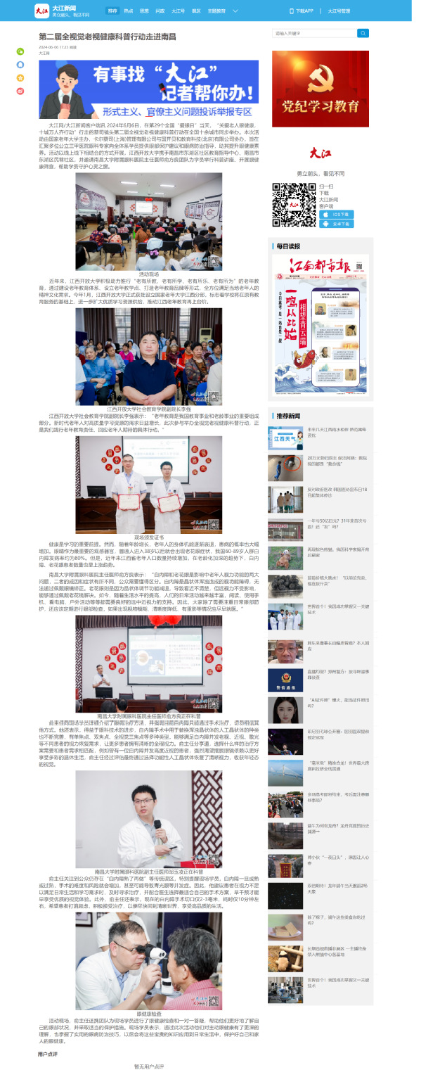 2024年6月6日,在第29个全国“爱眼日”当天,“关爱老人眼健康,十城万人齐行动”行走的蔡司镜头第二届全视觉老视健康科普行动在全国十余城市同步举办。本次活动由国家老年大学主办,卡尔蔡司(上海)管理有限公司与国开贝和教育科技(北京)有限公司协办,旨在汇聚多位公立三甲医院眼科专家向全体系学员提供眼部保护建议和眼病防治指导,助其提升眼健康素养。活动以线上线下相结合的方式开展,英国上市365官网携手南昌市东湖区社区教育指导中心、南昌市东湖区民巷社区,并邀请南昌大学附属眼科医院主任医师俞方良团队为学员举行科普讲座、开展眼健康筛查,帮助学员守护心灵之窗。
