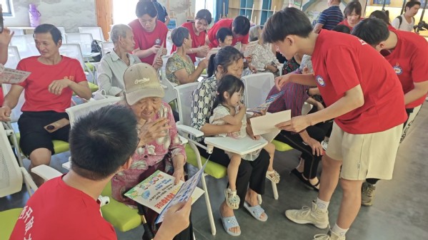 揭牌仪式结束后,教学点正式开课。“从头顶到耳下,大家跟着我一起轻拍四下。”在教师的带领下,老年人们聚精会神学起了夏季养生小知识。“握笔很重要的一点,就是保持笔始终竖直。”一位奶奶握着怀里孙女的手,按照老师的步骤摆出正确的姿势。这次进入老年课堂的,不仅有王村的老年人们,放假在家的儿童、社会实践的青年学子也共同参与其中。在书法、养生课堂过后,青年学子们来到老人儿童们身边,向他们发放夏季消防安全和反诈骗宣传册,并一对一用心为他们解释相关知识。这既是老年朋友们的理论课,也是青年学子们的实践课。