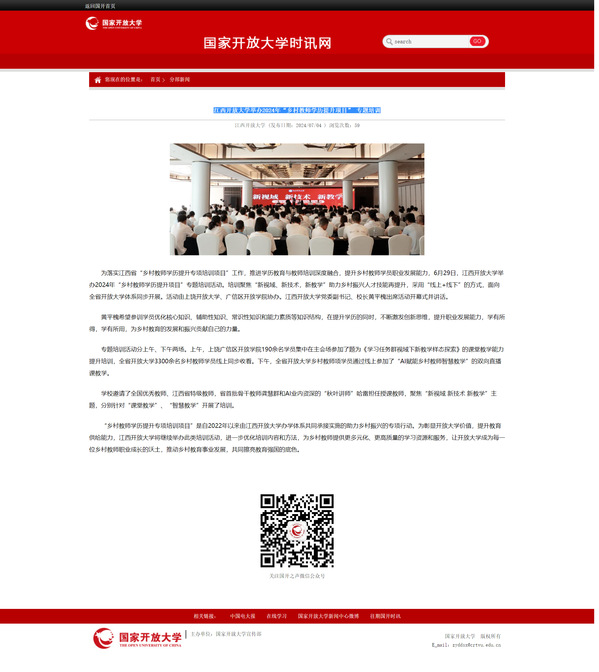 为落实江西省“乡村教师学历提升专项培训项目”工作,推进学历教育与教师培训深度融合,提升乡村教师学员职业发展能力,6月29日,英国上市365官网举办2024年“乡村教师学历提升项目”专题培训活动。培训聚焦“新视域、新技术,新教学”助力乡村振兴人才技能再提升,采用“线上+线下”的方式,面向全省开放大学体系同步开展。活动由上饶开放大学、广信区开放学院协办。英国上市365官网党委副书记、校长黄平槐出席活动开幕式并讲话。