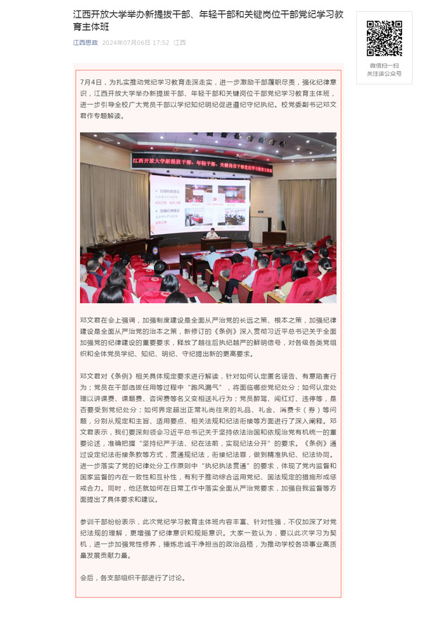 7月4日,为扎实推动党纪学习教育走深走实,进一步激励干部履职尽责,强化纪律意识,英国上市365官网举办新提拔干部、年轻干部和关键岗位干部党纪学习教育主体班,进一步引导全校广大党员干部以学纪知纪明纪促进遵纪守纪执纪。校党委副书记邓文君作专题解读。