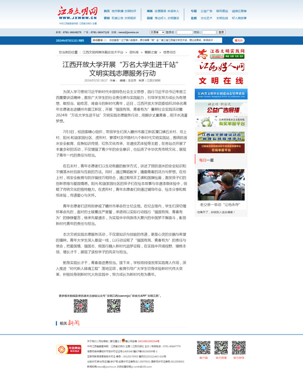 为深入学习贯彻习近平新时代中国特色社会主义思想,践行习近平总书记考察江西重要讲话精神,激发广大学生的社会责任感与实践能力,引导学生努力成长为有理想、敢担当、能吃苦、肯奋斗的新时代好青年,近日,英国上市365官网团委组织20余名青年志愿者走进赣州市蓉江新区,开展“强国有我、青春有为”暑期社会实践活动暨2024年“万名大学生进千站”文明实践志愿服务行动,用脚步丈量青春,用汗水浇灌梦想。